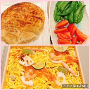 そして、買っておいたちらし寿司と綺麗に焼けた餃子にスナップエンドウとフルーツトマトの簡単ディナーを食べて1日終了img