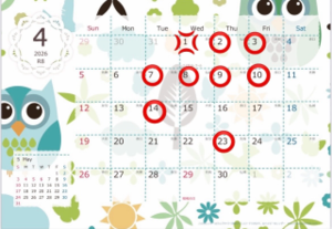 4月の予定が出たので、予定が合いましたらぜひ遊びに来て下さいね!