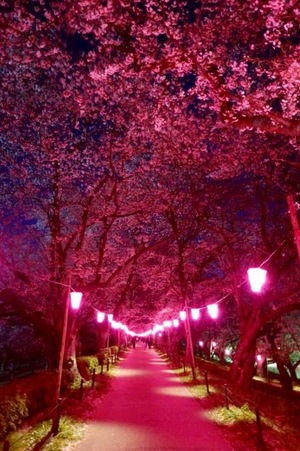 ピンクの灯篭が、幻想的な雰囲気を