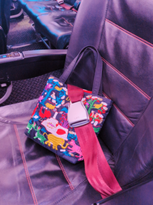 飛行機の中がガラガラだったので、ラオスで買った今いちばんお気に入りのカバンもシートベルトして遊んでたら…