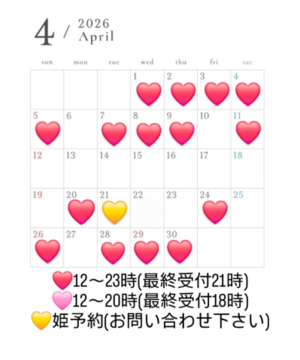 約1週間お休み頂くので、次回出勤は4/20です?20日以降もご予約お待ちしております?