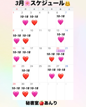おはよ???あんりです?今日は、10:00〜出勤だよ?ご都合あいます紳士様?えちえち...?イチャイチャ楽しみましょ♪当日・直前のお問い合わせ?お待ちしてます?……………?……………2月?も明日で終わりだねー??3月のスケジュール?も作りました...?今日も、1日頑張ろうね??????????xoxo秘書室?あんり?