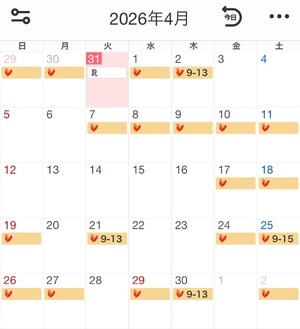 4月の予定です。??マークが出勤日です。