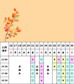 なんとちょうど半分ご予約埋まってます、なんか11月早くてびっくり???ロングのお誘いも多くて嬉しいぞーー!