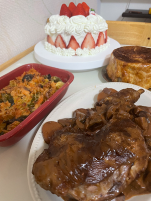 クリスマスの日は、先日焼いたスポンジにクリームと苺をたっぷり乗せて、チキンも焼いて、何となくクリスマスっぽい夕食にしました。