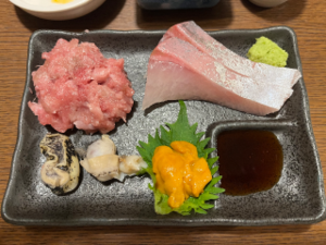 あん肝とネバネバ海藻→刺身の盛り合わせ?→あん肝鍋→雑炊