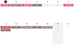 ピンクのところは出勤予定日、茶色の?はリクエスト可能日になります!