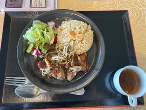 お昼ご飯、欲張ってステーキ&ガーリックライスにしてしまいました