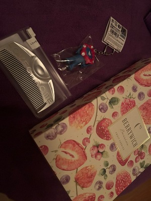 お誕生日プレゼントに、美味しいお菓子とミャクミャクキーホルダーとラブクロムのクシをプレゼントありがとうございます❤️髪の毛ツヤツヤになりますように🪄