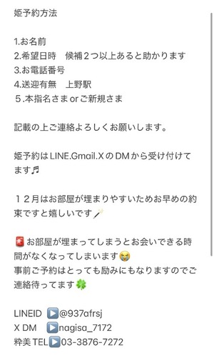 姫予約方法は、LINE、Gmail、XのDMから可能です♡