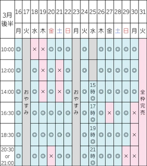 土日祝は特に早い時間帯(10:00/12:00/14:00)が