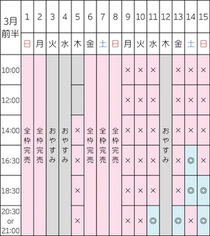 土日祝は特に早い時間帯(10:00/12:00/14:00)が